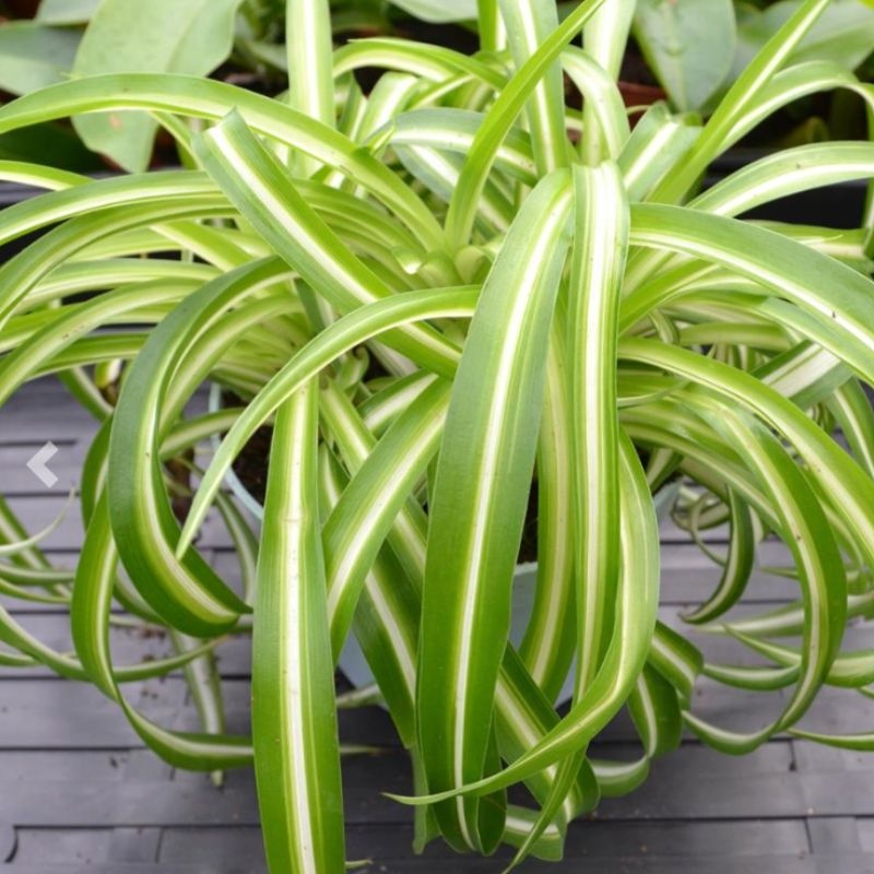 Spider Plant ‘Bonnie’ is a playful twist on the classic spider plant, featuring curly, arching leaves instead of straight ones. Its bright green and creamy striped foliage adds texture and energy to indoor plant collections.