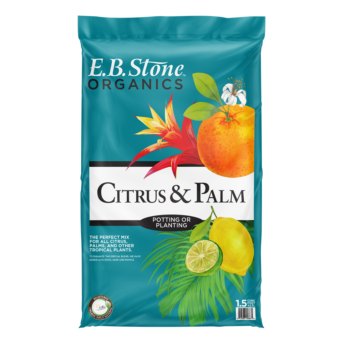 E.B. Stone Organics Citrus & Palm Potting or Planting is a versatile mix and can be used as both a soil amendment or as a ready-to-use potting soil. Our 100% natural & organic mix is blended for all types of citrus, palms, and other tropical plants. This mix is blended to provide excellent aeration and water retention to help your citrus and other tropical plants thrive. Ingredients: Aged Fir Bark, Lava Rock, Sand, Volcanic Pumice, Aged Redwood, and Peat Moss.